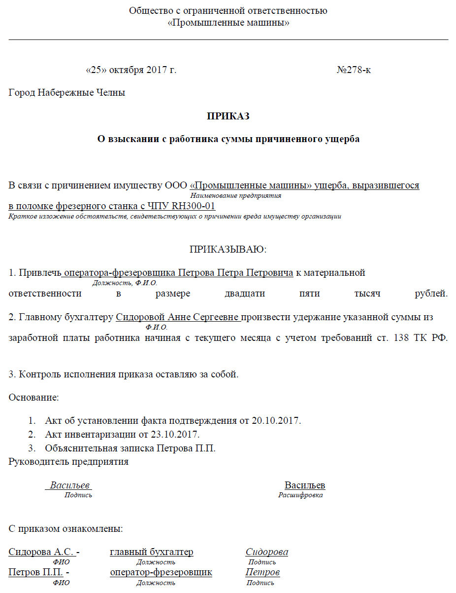 Этот способ самый распространенный. Он заключается в выполнении всех этапов привлечения работника к материальной ответственности, описанных ранее, и удержании необходимой суммы из зарплаты сотрудника на основании приказа руководителя. Документ должен быть оформлен в течение месяца с момента определения размера вреда и направлен в бухгалтерию.