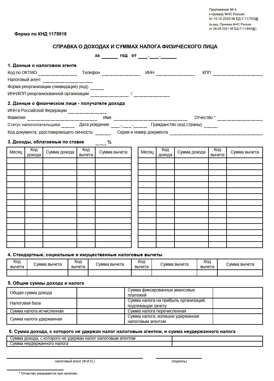 А с 2021 года налоговый агент выдает справки о доходах и суммах налога физлица. Она утверждена Приказом ФНС № ЕД-7-11/753@: