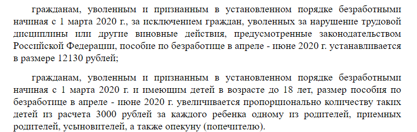 Чуть позже вышло постановление правительства №346 от 27.03.2020, в котором максимальный размер выплат поднят до 12 130 рублей (величины прожиточного минимума). Но распространение коронавируса внесло коррективы, и последние новости о пособиях по безработице в 2020 году порадовали и граждан, получивших статус безработных, и тех, для кого такая перспектива не за горами. По указанию президента правительство внесло изменения в постановление №346, по которому выплаты всем лицам, зарегистрированным на бирже труда и имеющим право на помощь от государства, увеличиваются до 12 130 рублей. Интересно, что эту сумму власти обязались выплачивать и тем, кто уволился после 30 марта, и тем, кому ранее уже назначили выплату, но она ниже установленного уровня. Изменения добавили льготы безработным: имеющим детей на каждого ребенка выплатят по 3 000 ежемесячно.