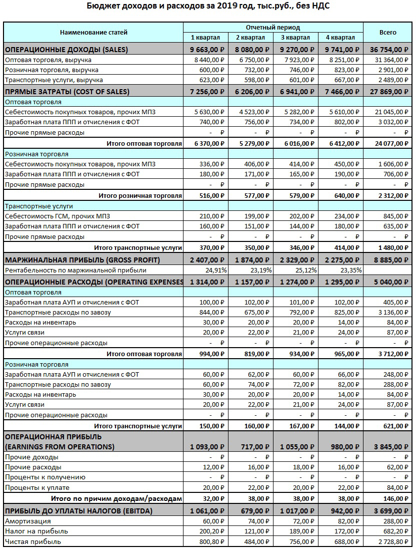 В качестве примера рассмотрим результат управленческого учета в виде таблицы Excel ©. Примером послужит БДР (бюджет доходов и расходов), в котором отражаются выручка компании, ее прямые и операционные расходы, налоги, прочие доходы и расходы (включая проценты по кредитным ресурсам и т. д.), прибыль от деятельности (рассчитанная с учетом применяемой системы, например: РСБУ или МСФО), а также налог на прибыль и чистая прибыль.