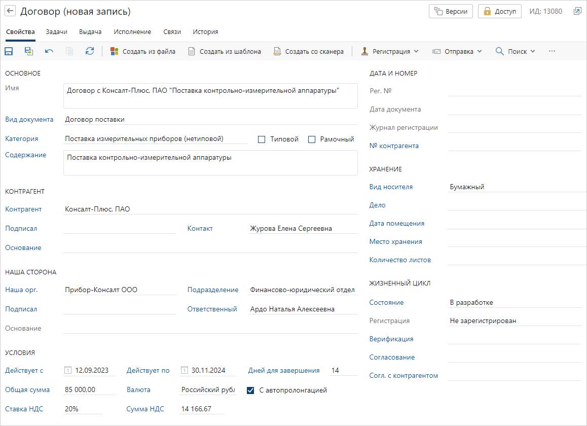 Все поступающие документы легко связываются между собой и формируют единый комплект. В карточке договора сразу видно, какие документы относятся к конкретному процессу и на каком этапе они находятся.