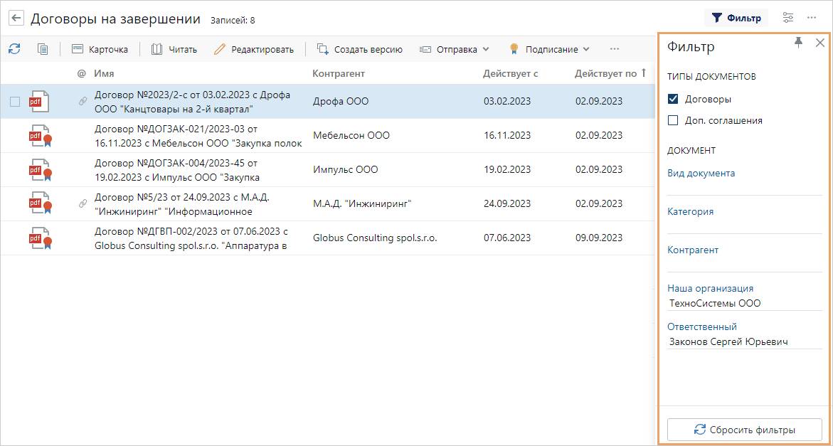 В системе Directum СЭД+ все договоры с приближающейся датой окончания доступны в отдельном списке «Договоры на завершении», что упрощает контроль и исключает пропущенные сроки.
