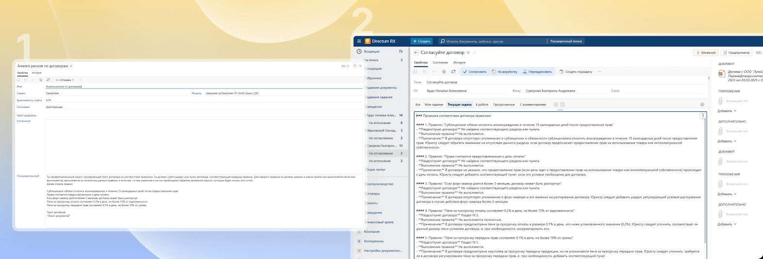 Ключевое преимущество — возможность настройки подобных сценариев проверки в no-code-редакторе системы без привлечения программистов. Юридическая служба сможет сама управлять критериями контроля и быстро обновлять их при изменении требований. Это минимизирует риски и освобождает ресурсы юристов для решения более сложных задач.