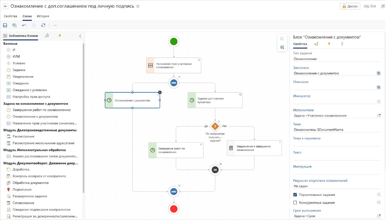 CLM-система ускоряет согласование за счет заранее настроенных маршрутов. Сотрудники отправляют договор по процессу, а задания на каждом этапе формируются автоматически — не надо думать, кому передать документ дальше. В Directum подобная функциональность реализуется благодаря инструментам гибкой настройки (no-code). Для этого аналитик или ведущий пользователь открывает редактор, где с помощью блоков задает схему процесса, прописывает роли, этапы, сроки и исполнителей по регламентам компании.