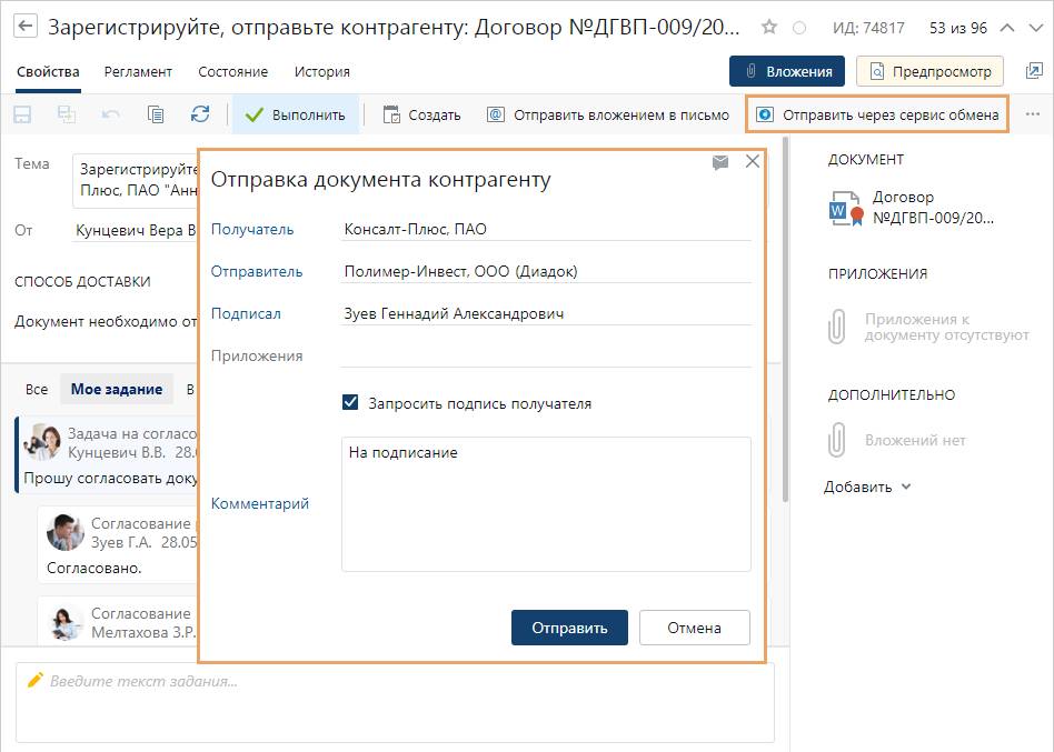 После согласования и подписания договор можно быстро перенаправить контрагенту при помощи интеграции с сервисами электронного обмена документами, такими как СБИС и Контур.Диадок. Отправка выполняется в несколько кликов, а факт передачи автоматически фиксируется в журнале оригиналов и копий с возможностью в любой момент уточнить статус и местоположение документа.