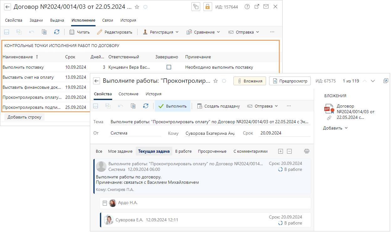 В CLM-системе, где налажена поддержка гибких процессов, для договора можно назначать контрольные точки и фиксировать ключевые события — поставку, подписание актов, оплату, завершение этапов. После выполнения задания система автоматически проставляет отметку в карточке договора, поэтому статус исполнения всегда актуален и прозрачен для всех участников процесса.