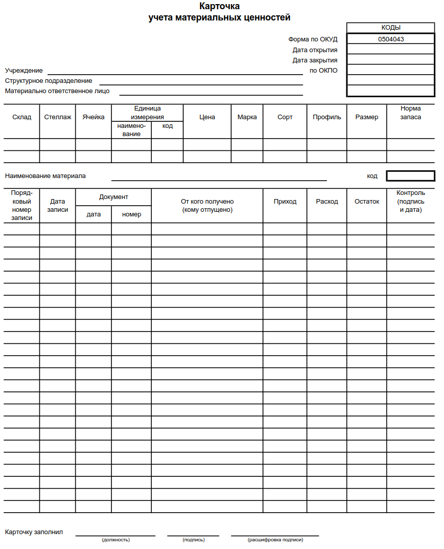 Единый бланк складской карточки учета материалов отсутствует. С введением закона «О бухучете» № 402-ФЗ компании не обязаны применять унифицированные образцы. Формы, утвержденные Госкомстатом и Минфином, остаются только рекомендацией.