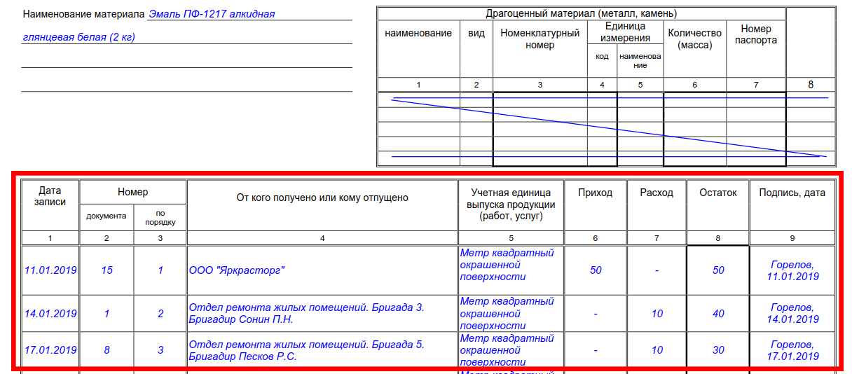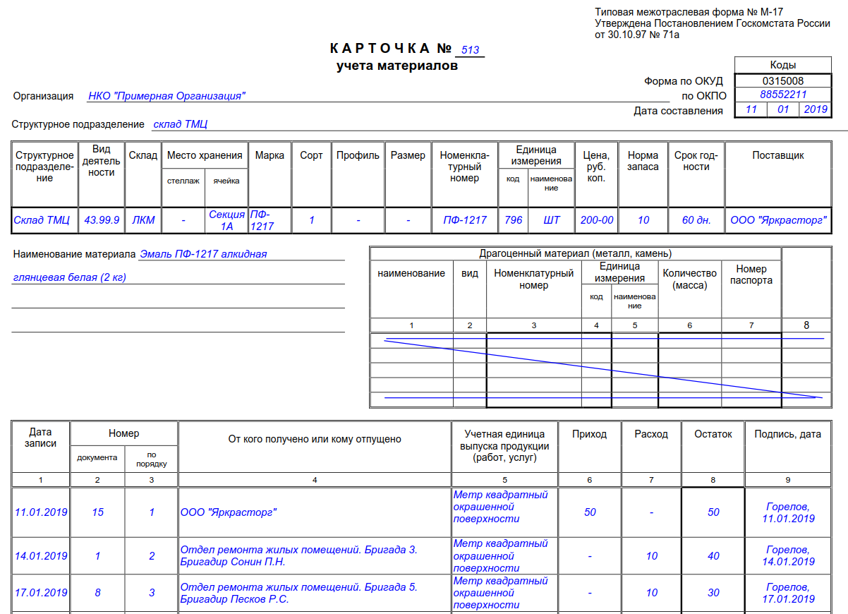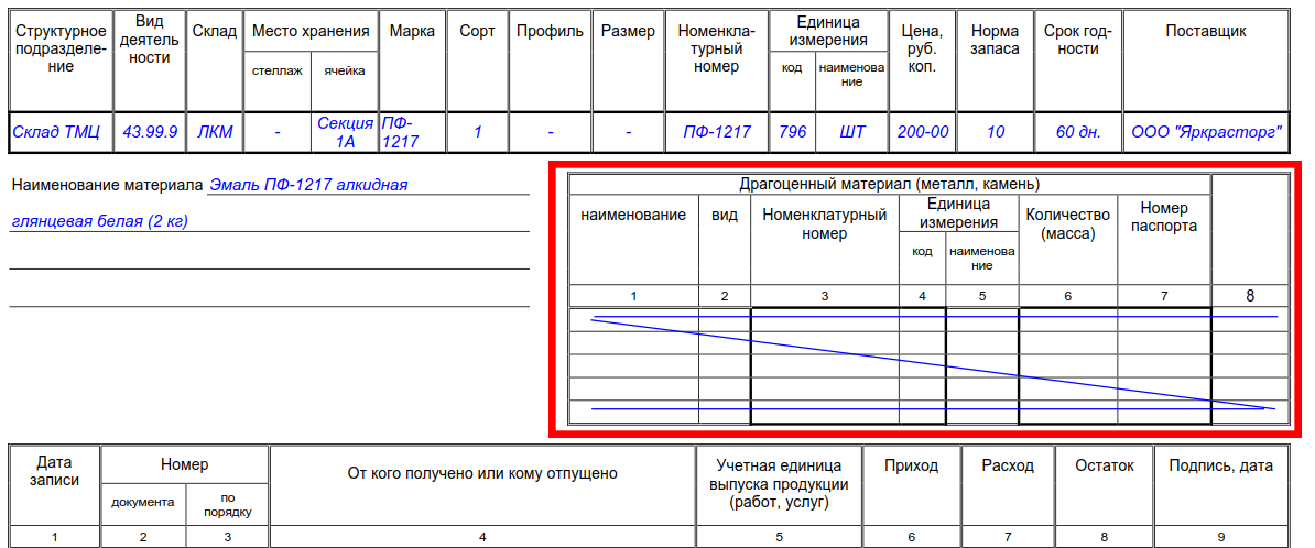В карточке складского учета материалов регистрируются не только сведения о поступлении, перемещении и выбытии активов. Формуляр детализирует информацию о качественных характеристиках ТМЦ, стоимостном и количественном выражении.