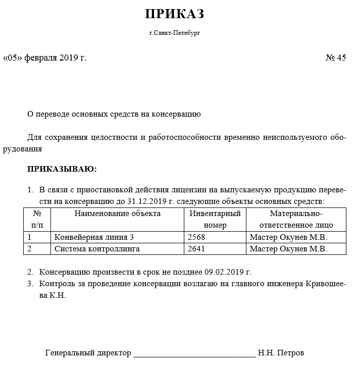 Образец приказа о консервации основных средств