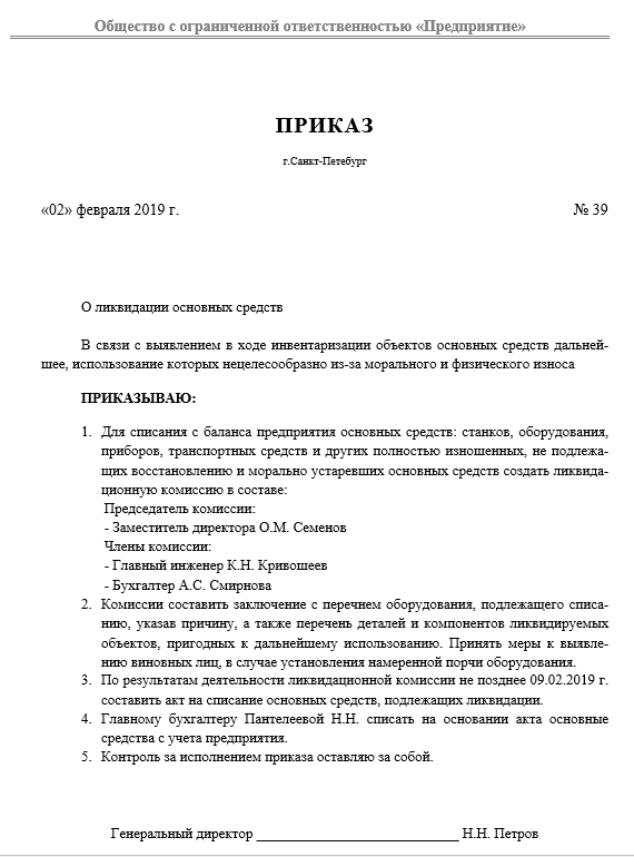 Образец приказа о списании основных средств