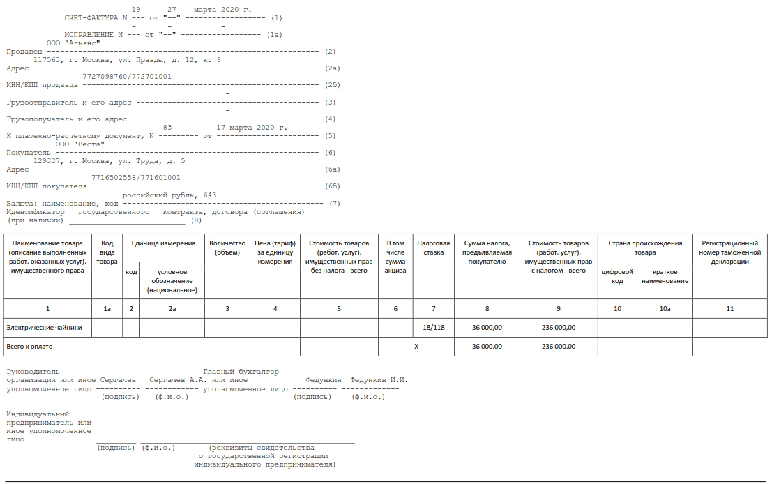 2, 2а, 2б, 6, 6а, 6б — данные продавца и покупателя в соответствии со сведениями в ЕГРЮЛ: наименование и адрес указывают сокращенное или полное (письмо Минфина № 03-07-09/1846 от 17.01.2018), ИНН и КПП;