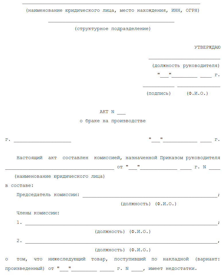 На обнаруженный внутренний (исправимый или неисправимый) дефект составляется акт списания брака на производстве по форме, разработанной и утвержденной организацией, с обязательными реквизитами, перечисленными для первичного документа в законе 402-ФЗ. Кроме этого, в акте должна содержаться следующая информация: