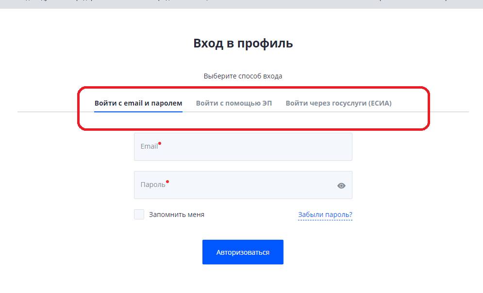 Шаг 4. Откроется форма «Вход в профиль», где представлены несколько вариантов: с помощью имейла и пароля в личном кабинете сайта, с помощью ЭП или через «Госуслуги» (ЕСИА).