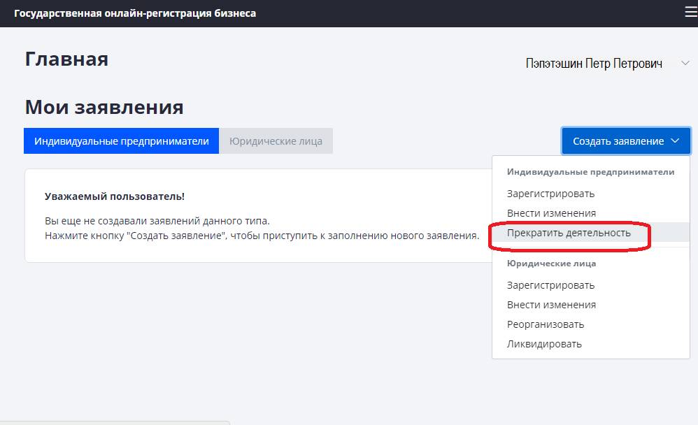 Шаг 5. После входа откроется форма «Мои заявления». Нажмите на «Создать заявление», затем «Прекратить деятельность».