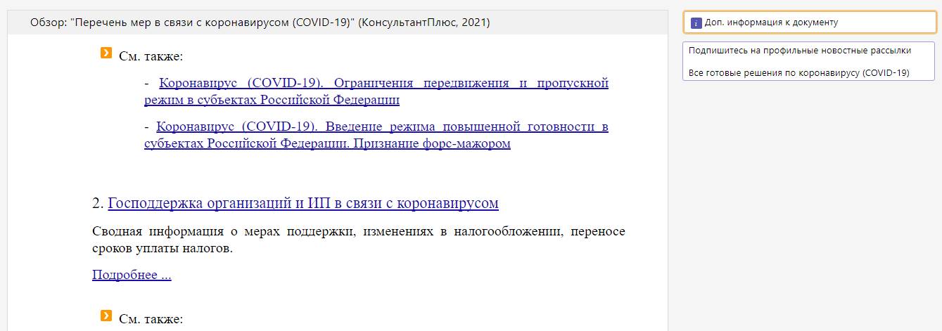 КонсультантПлюс собрал в одном обзоре все актуальные правила: что запрещено, а что разрешено, обязательно ли носить маски, какие меры поддержки еще действуют и какие денежные выплаты еще могут получить физлица и организации. Удобно следить за изменениями. На 2 дня доступ бесплатный.