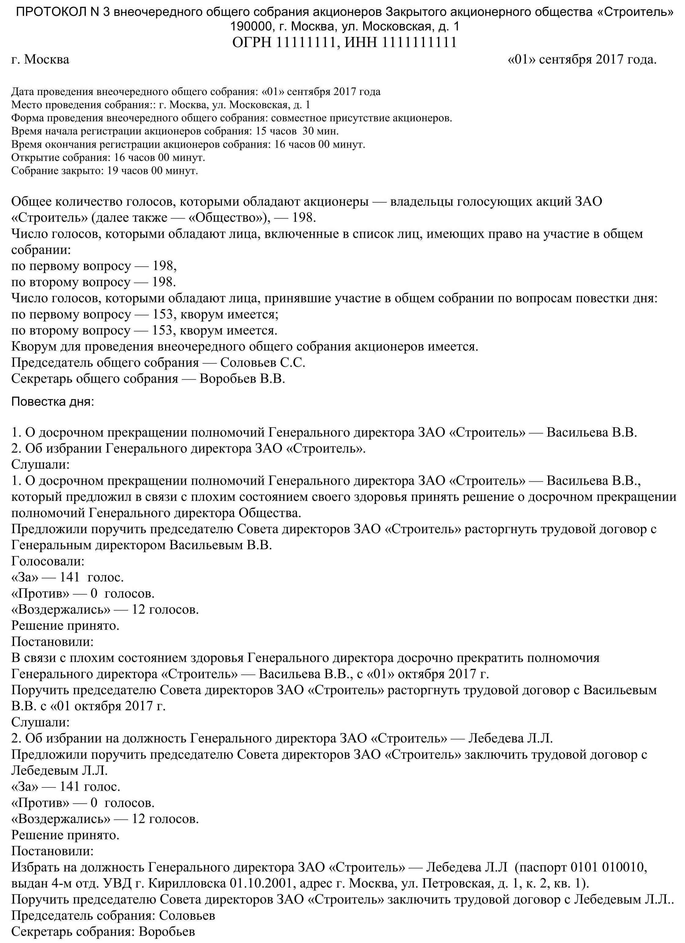 Согласно пункту 3 статьи 69 Закона, СД обладает правом образования и прекращения полномочий исполнительных органов. Протокол этого мероприятия будет несколько отличаться от представленного выше образца.