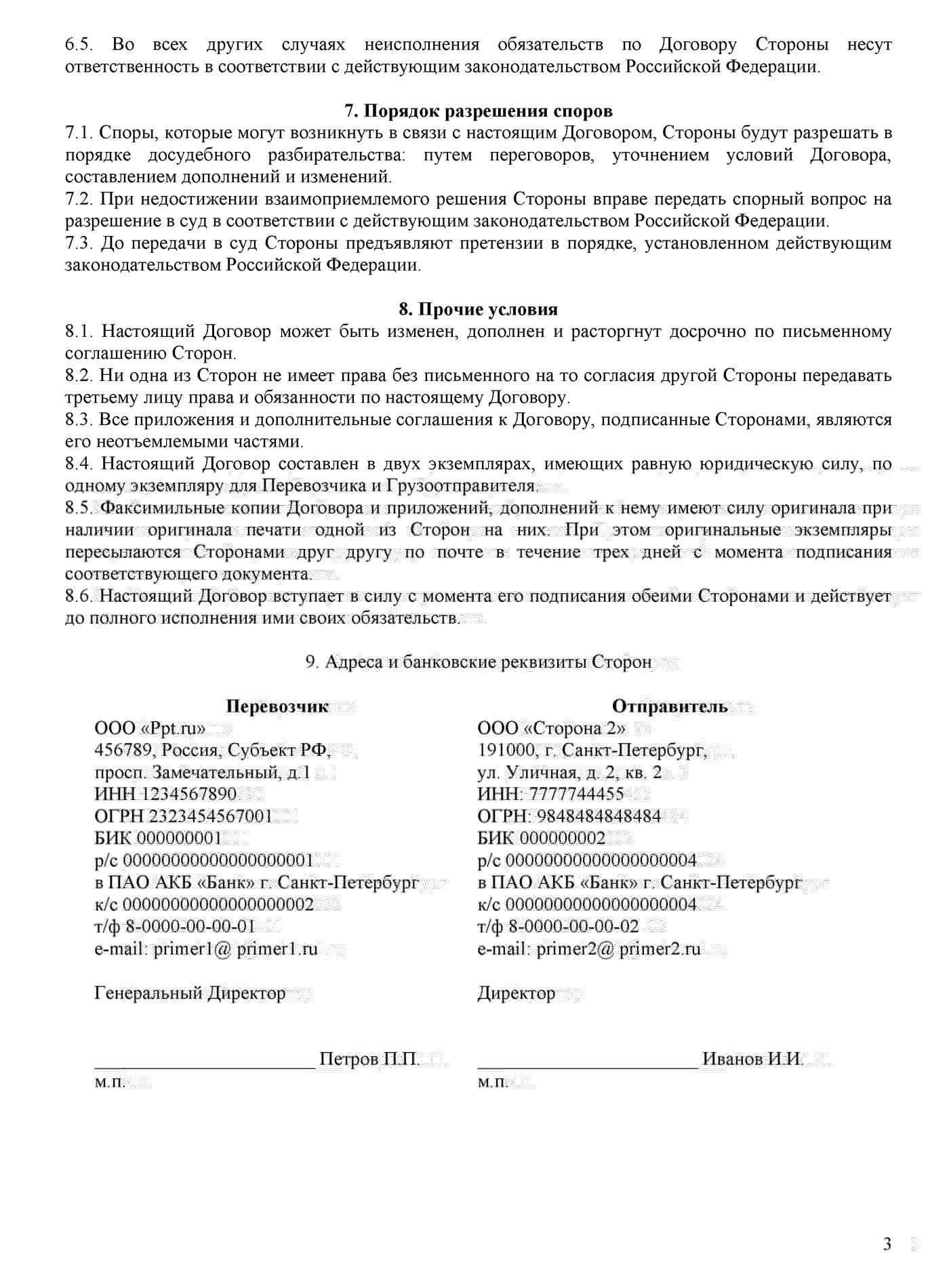 На законодательном уровне шаблон договора не установлен, поэтому использование вышеуказанного порядка расположения условий в документе является необязательным. Рекомендуем придерживаться установленной структуры, потому что она является более понятной и общепринятой на основании складывающейся практики в области правоотношений по грузоперевозкам.