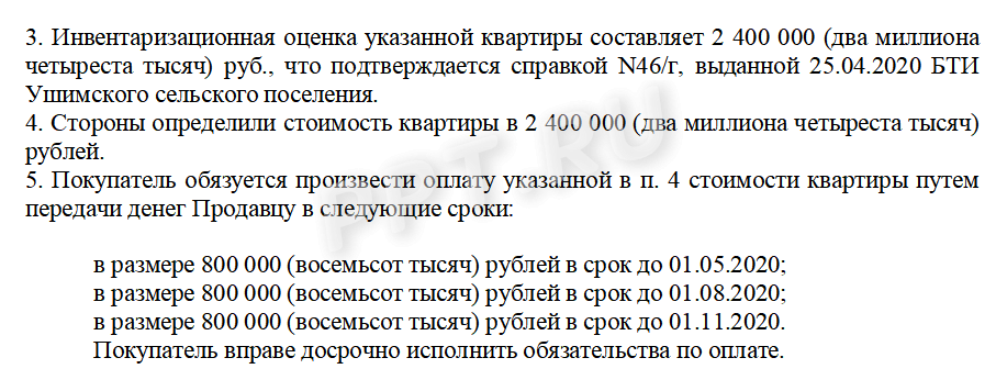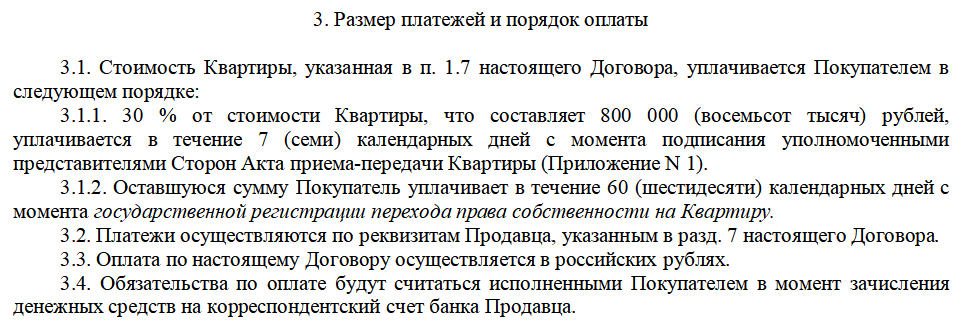 - Цена сделки, порядок внесения денежных средств и сроки платежей. При продаже недвижимости в рассрочку пропишите подробные условия оплаты и периодичность внесения платежей. Если за представление рассрочки предусмотрена плата, определите ее размер. Предусмотрите меры ответственности за нарушение сроков оплаты.