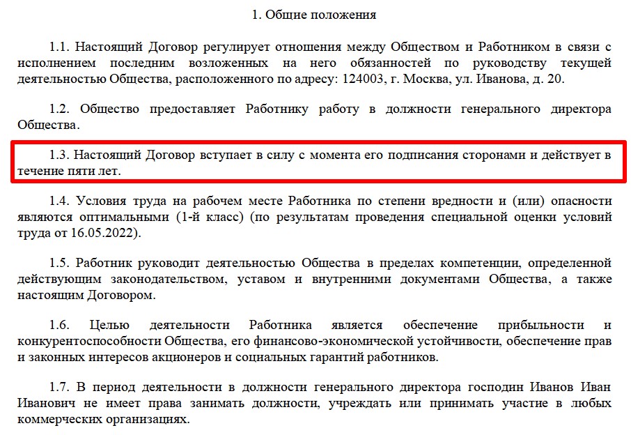 Описывая предмет договора, если работа в должности руководящего лица общества основная, укажите, вправе ли работник трудиться по совместительству в других фирмах или он не вправе занимать иные должности. В образце сформулировано разрешение или запрет на занятие иных должностей: разрешение в образце подчеркнуто зеленым цветом, запрет — красным.