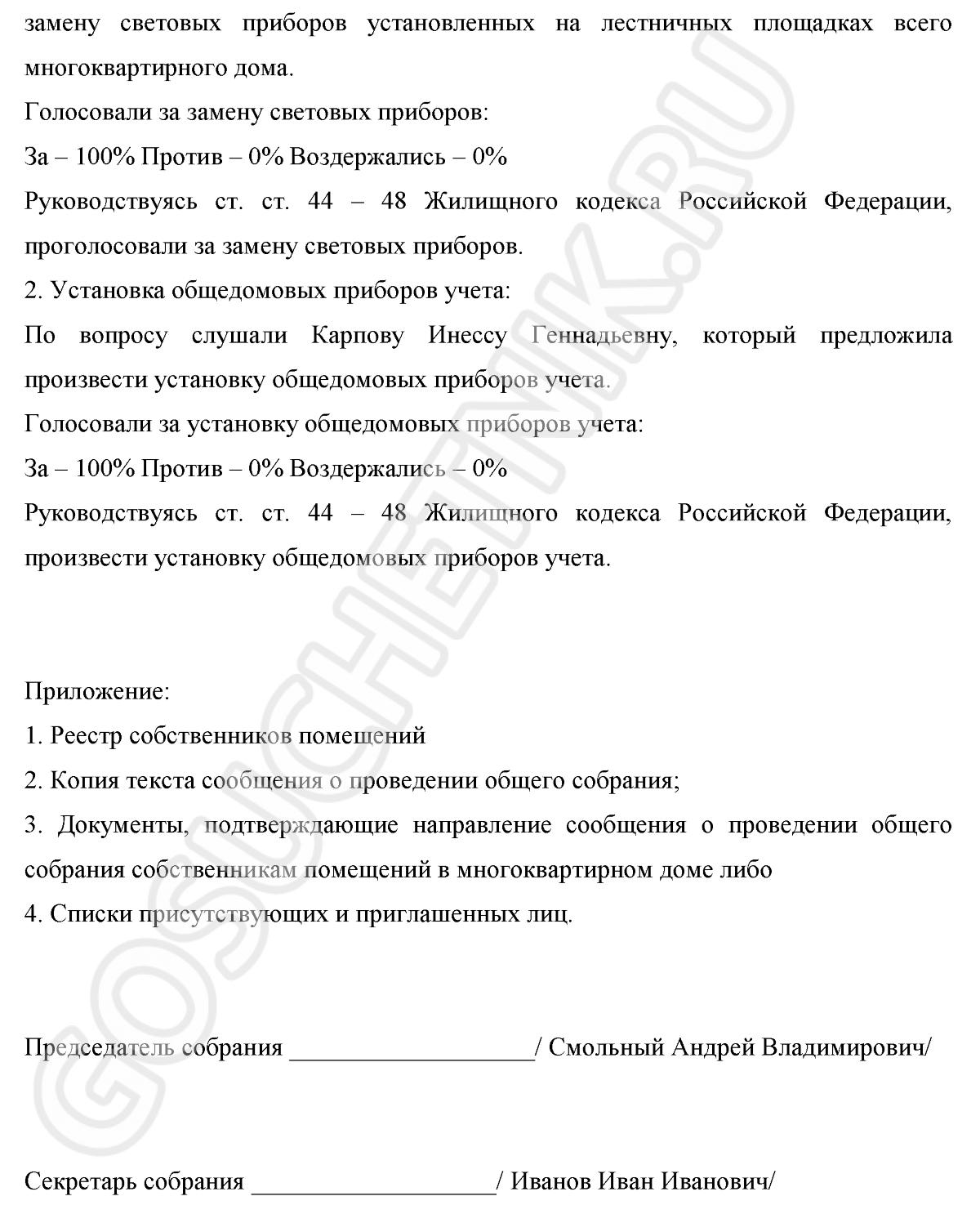 | Протокол №12 внеочередного общего собрания собственников помещений в МКД по адресу: г. Город, ул. Уличная, д. 234 г. Город / 19 марта 2021 г. г. Город, ул. Уличная, д. 234, холл подъезда №3 Время начала регистрации участников заседания: 18 часов 00 минут. Время окончания регистрации участников заседания: 18 часов 15 минут. Начало: 00 часов 00 минут. Окончание заседания: 00 часов 00 минут. Форма проведения: Очно. Инициатор проведения: собственник кв. 2 Московский Владислав Алексеевич, собственность на жилое помещение подтверждается выпиской из ЕГРН от 00.00.0000 №00/0001/000000001. Общая площадь помещений МКД составляет 00 000 кв. м. Площадь многоквартирного дома, находящаяся в собственности граждан, — 00 000 кв. м. Площадь многоквартирного дома, находящаяся в собственности юридических лиц, — 0 000 кв. м. Площадь многоквартирного дома, находящаяся в государственной (муниципальной) собственности, — 0 кв. м. Кворум имеется. Управление нежилыми помещениями осуществляет ГБУ «Управление» на основании Договора №00 от 00.00.0000 г. Присутствовал главный инженер Катамаранов Игорь Александрович ГБУ «Управление», действующий на основании Доверенности №1 от 00.00.0000 г. Повестка дня: 1. Размещение рекламной конструкции на общедомовом имуществе: По вопросу слушали Смирнова Алексей Анатольевич, который предложил заключить договор на размещение рекламной конструкции на общедомовом имуществе, с целью использования полученных от аренды денег для решения общедомовых задач. Голосовали за проведение ремонта: За — 100% Против — 0% Воздержались — 0% Руководствуясь статьями 44–48 ЖК РФ, решено заключить договор на размещение рекламной конструкции на общедомовом имуществе. 2. Установка системы видеонаблюдения: По вопросу слушали Иванова Порфирия Петровича, который предложил оснастить подъезды многоквартирного дома системой видеонаблюдения с установкой камер в количестве 6 штук. Порядок расположения камер и технические характеристики устанавливаются приложением. Рассмотреть варианты заключения договора для осуществления технических работ. Голосовали за установку системы видеонаблюдения: За — 100% Против — 0% Воздержались — 0% Руководствуясь статьями 44–48 ЖК РФ, принято решение произвести установку системы видеонаблюдения. Заключить договор на осуществление работ с организацией ООО «Пример» ОГРН 1234568901. Определить стоимость работ не превышающей 70 000 рублей. Согласовать условия о сроках выполнения работ — в течение 14 календарных дней с момента подписания договора. Приложение: 1. Реестр лиц, владеющих помещениями на праве собственности. 2. Бланк предварительного сообщения. 3. Квитанции о направлении сообщений. 4. Списки лиц. 5. Технические требования к установке системы видеонаблюдения. Председатель ___________________/ Смирнов Олег Олегович / Секретарь ___________________/ Петровская Ирина Владимировна / |