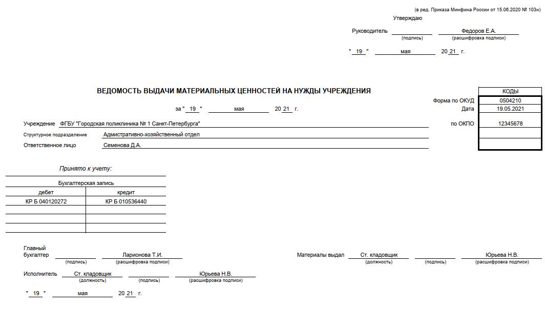 Такие организации не вправе самостоятельно разрабатывать бланки первичного учета, поэтому используют унифицированные формы. Бланк ведомости выдачи ТМЦ на нужды учреждения заполняется материально-ответственным лицом.