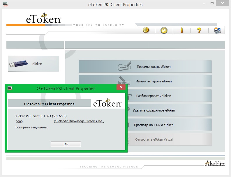 2. Далее необходимо проверить настройки токена. Для этого должен быть установлен нужный драйвер. Скачать его можно на сайте произодителя: Рутокен, eToken или jaCarta. После этого откройте приложение токена и выберите «О программе».