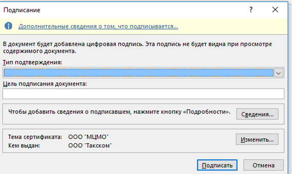 Выберите команду «Добавить цифровую подпись», после чего появится диалоговое окно, в котором выберите сертификат, укажите цель подписания и нажмите кнопку «Подписать».