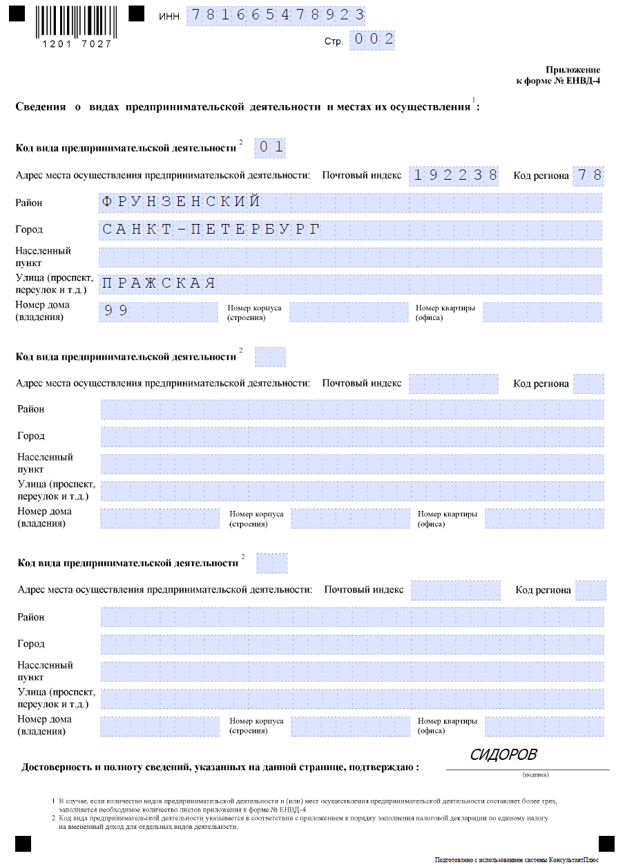 Приложение к форме или вторая страница заявления может заполняться не полностью. Если ИП на ЕНВД осуществлял только один вид предпринимательской деятельности, то его и надо указать. Если бизнесмен работал в нескольких сферах, то он вписывает либо все, либо те, по которым он больше не планирует применять льготный режим.