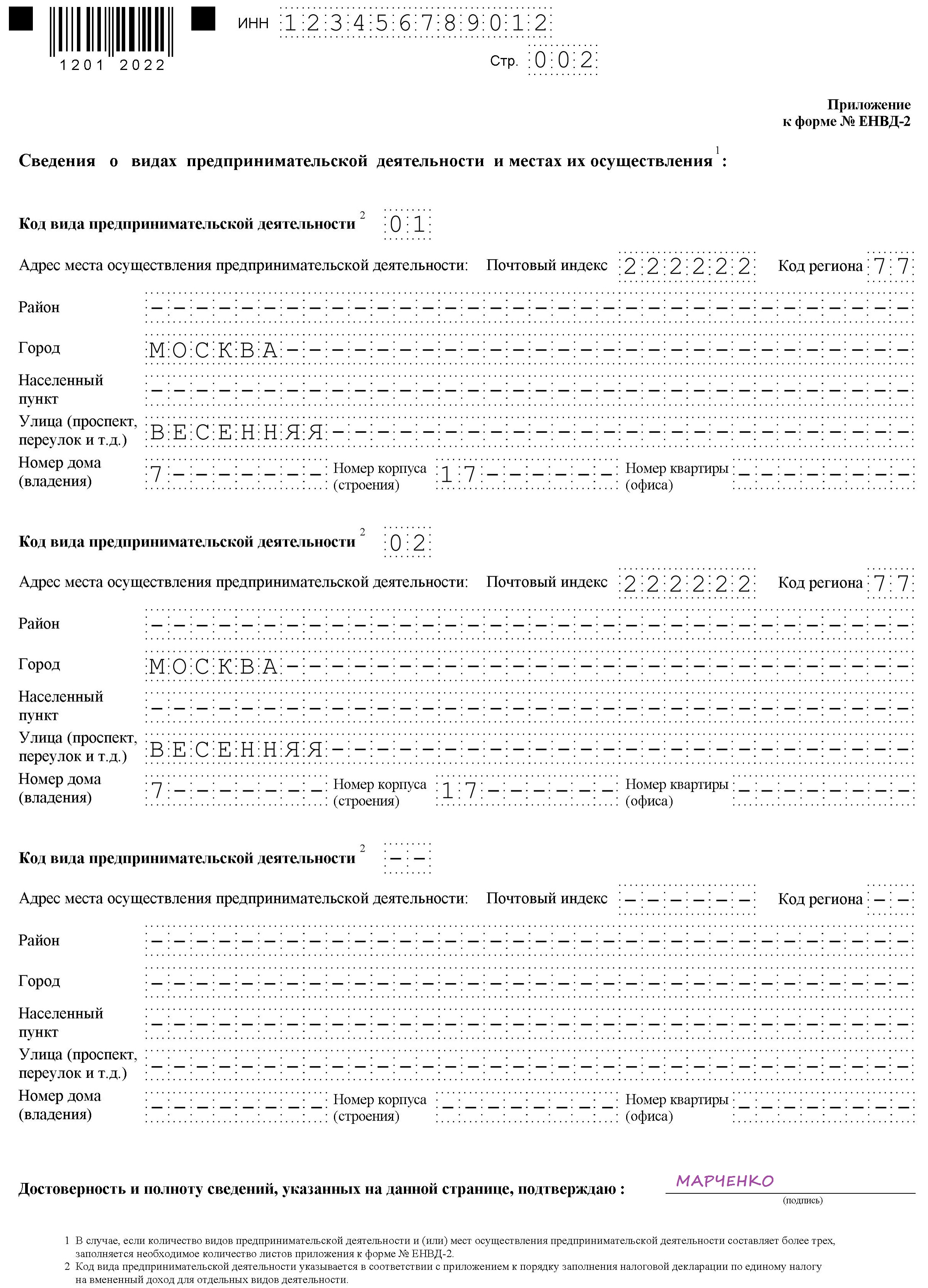 Также на второй странице уточняется точный адрес места ведения бизнеса, включая индекс. Если льготу планируется применять к нескольким видам бизнеса, налоговиков уведомляют о каждом.