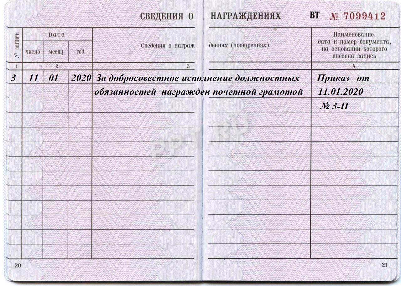 Информация о наградах записывается на специально отведенных страницах трудовой книжки. Туда заносится информация о награде, которой удостоен работник. Это грамота, диплом, благодарность и другой вид награды. Записи имеют свою порядковую нумерацию.