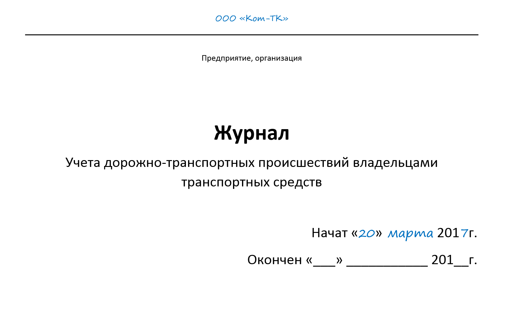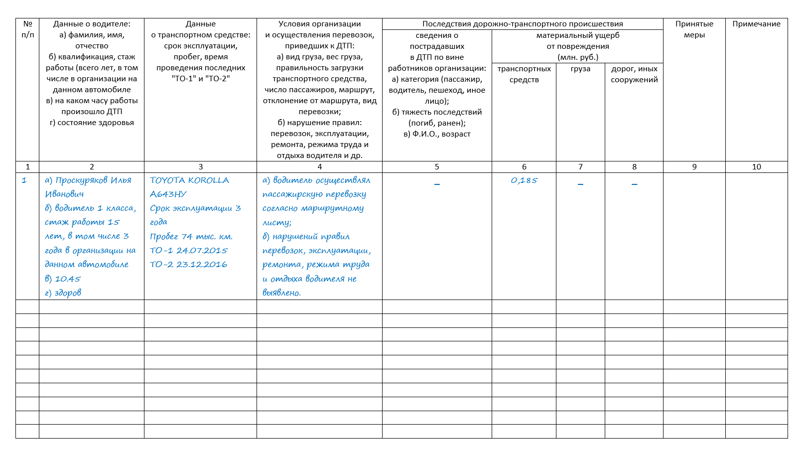 Журнал учёта ДТП - образец заполнения для организации