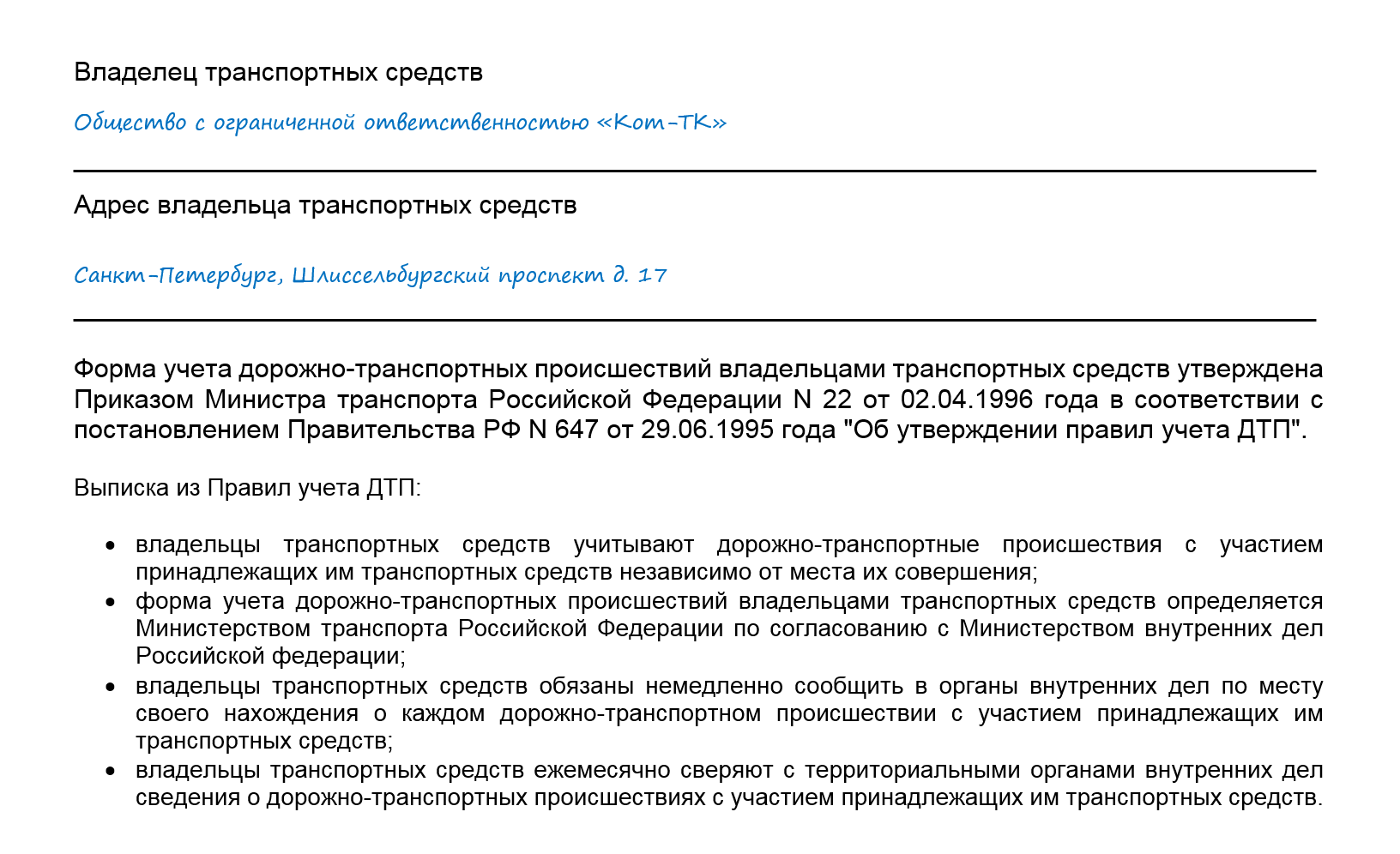 Юридические лица, владеющие автотранспортными средствами, обязаны вести учёт любых происшествий на дорогах с участием их водителей и автомобилей.