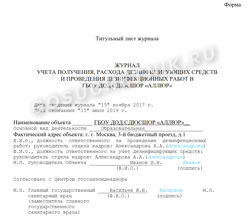 В соответствии с Постановлением Главного государственного санитарного врача РФ от 18.05.2010 № 58, к примеру, в медицинских учреждениях журнал заполняет тот, на кого возложена ответственность по приему и выдаче дезинфицирующих препаратов.