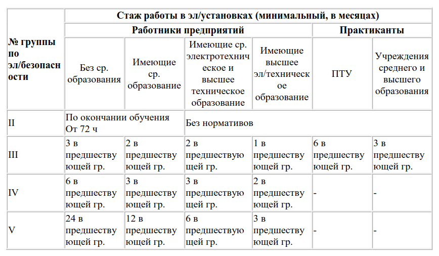Таблица групп по электробезопасности до и выше 1000 В для эл/технического персонала: