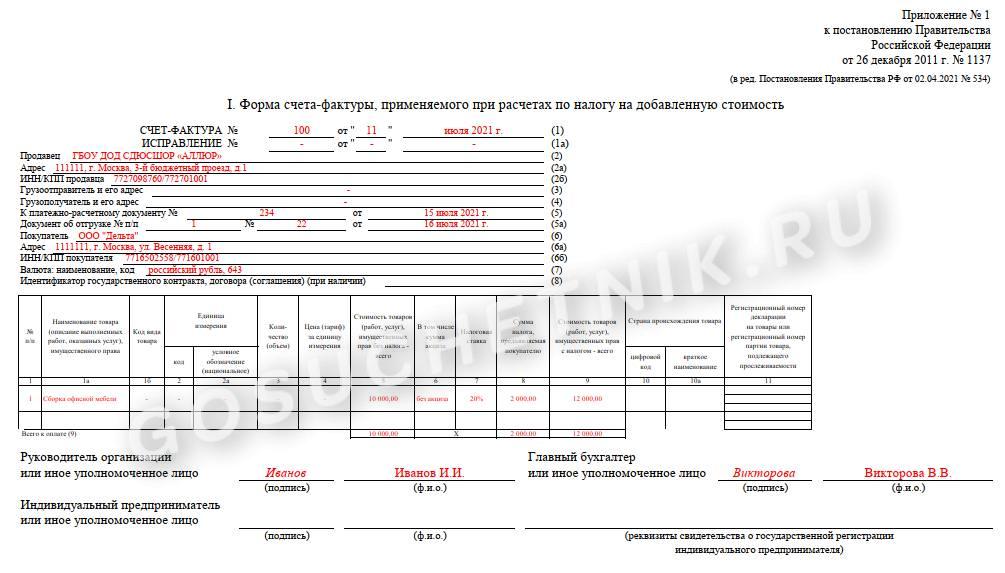 Образец счета-фактуры с 01.07.2021