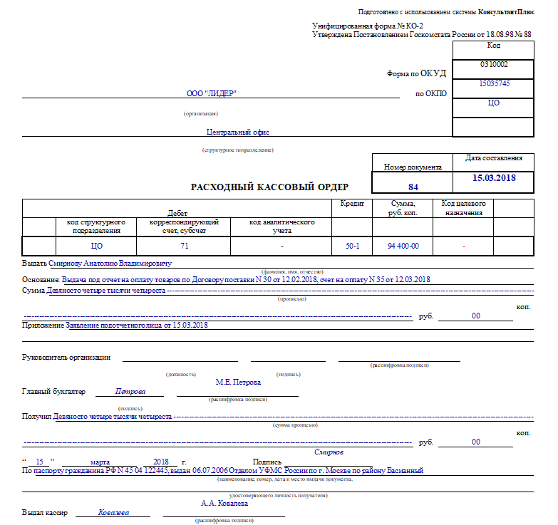 Образец расходно-кассового ордера