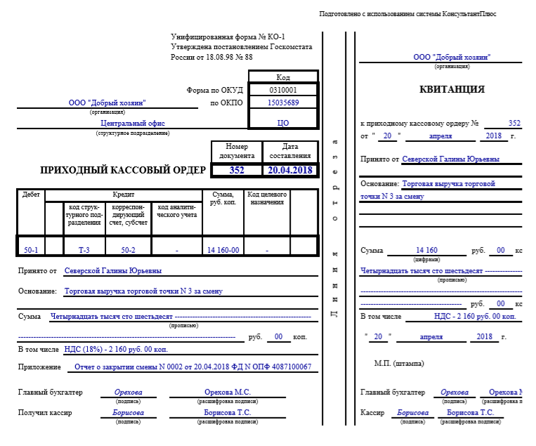 Образец приходно-кассового ордера