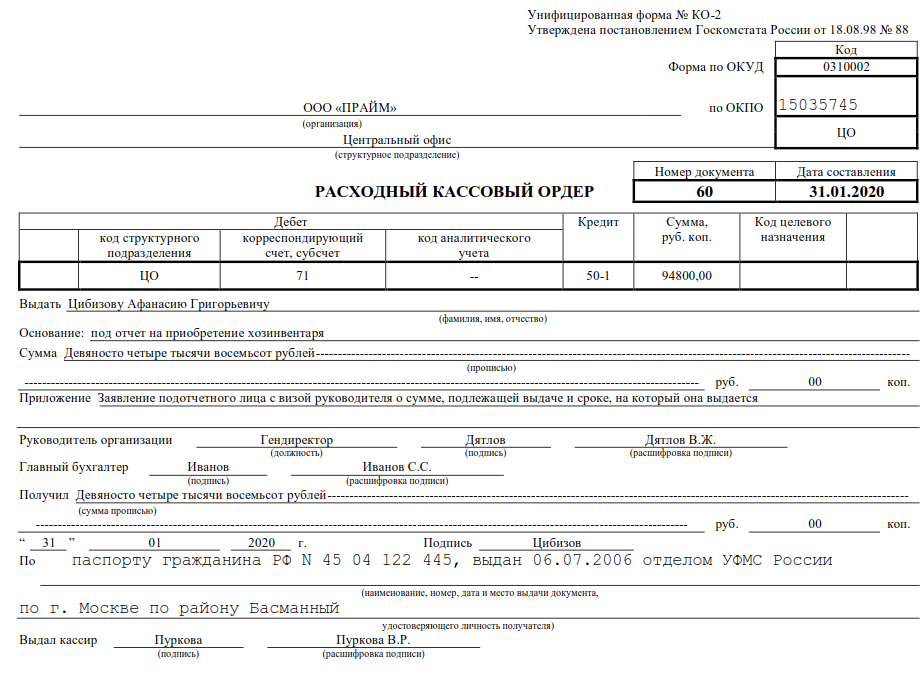 Пример заполнения расходного кассового ордера