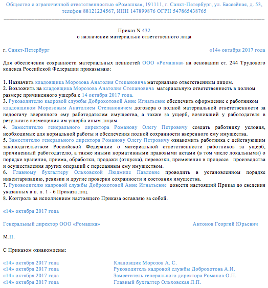 Образец приказа о назначении материально ответственного лица выглядит следующим образом: