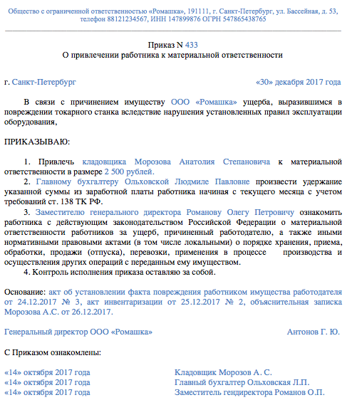 Материальная ответственность работника — это его обязанность возместить прямой ущерб, причиненный им работодателю. Но для того чтобы получить возмещение, работодатель должен правильно оформить отношения с работником. Как это сделать пошагово, читайте в статье. Образец приказа о материальной ответственности работника (2017) пригодится вам для создания собственного документа.
