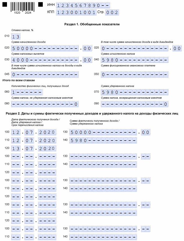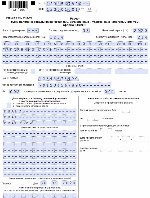 Отчет 6-НДФЛ за третий квартал (для наглядности заполнен только по примеру):