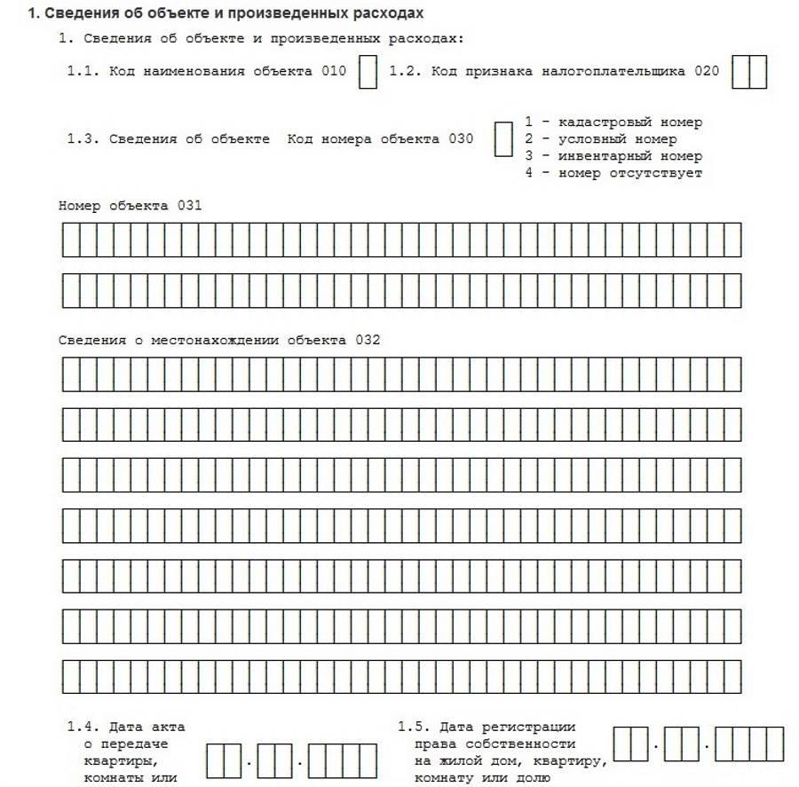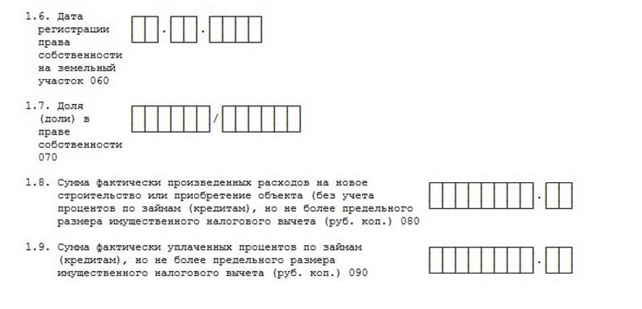 Седьмой детализирует НВ по расходам на новое строительство или покупку недвижимости. Здесь нужно заполнить сведения об объекте, внести даты приема-передачи и регистрации в собственность и долю в праве. На этой же странице приводят уплаченные проценты по ипотеке, которые можно принять для уменьшения налогооблагаемой базы.