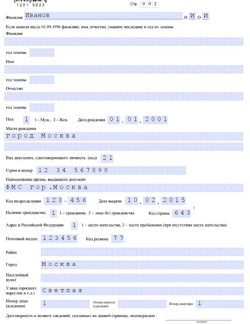 Образец заполнения бланка заявления