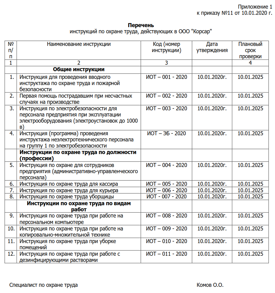 Вот примерный образец перечня действующих инструкций по охране труда в соответствии с видами деятельности предприятия.