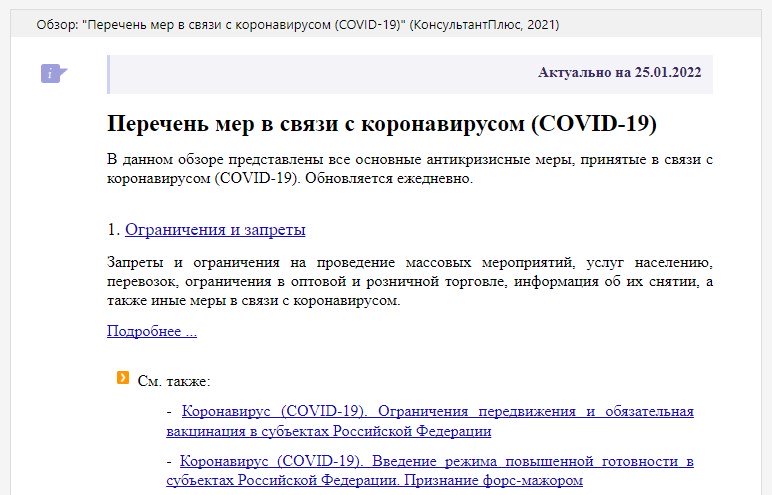 КонсультантПлюс собрал в одном обзоре все актуальные правила: что запрещено, а что разрешено, обязательно ли носить маски, какие меры поддержки еще действуют и какие денежные выплаты еще могут получить физлица и организации. Удобно следить за изменениями. На 2 дня доступ бесплатный.