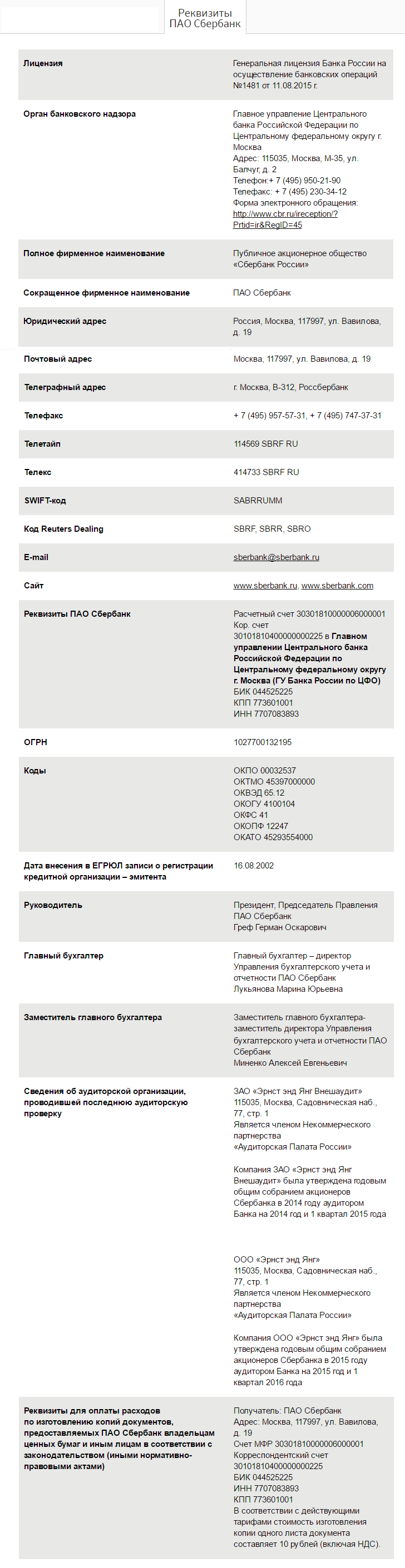 Посмотрим образец реквизитов организации на примере ПАО Сбербанк. Картинка ниже — официально опубликованная на сайте кредитной организации информация.