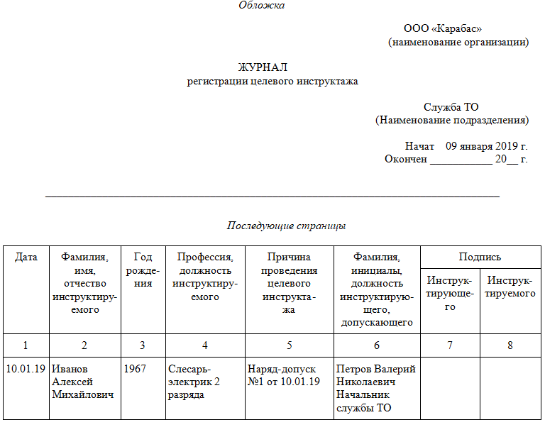 Даже если оформляется наряд-допуск, в котором проставляется отметка о прохождении инструктирования, в компании должен существовать отдельный журнал. Форма его рекомендована в Приложении А.6 ГОСТа 12.0.004-2015. Если у вас возникают сложности с заполнением, ознакомьтесь с образцом.