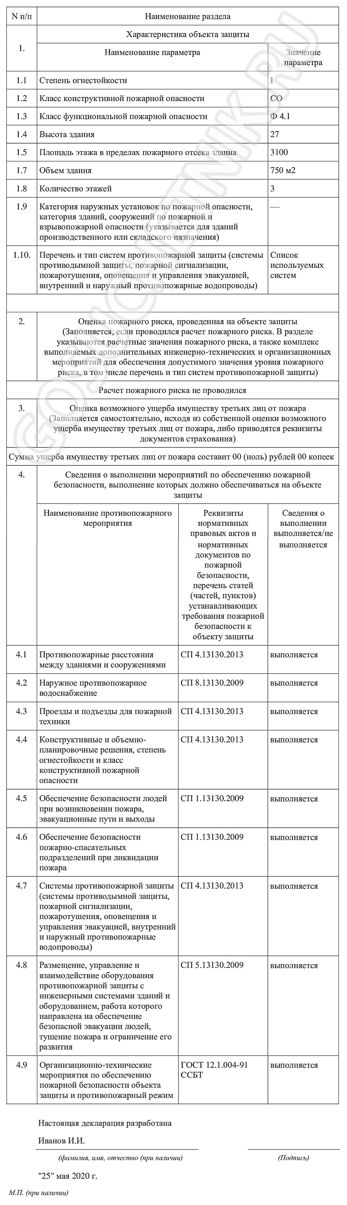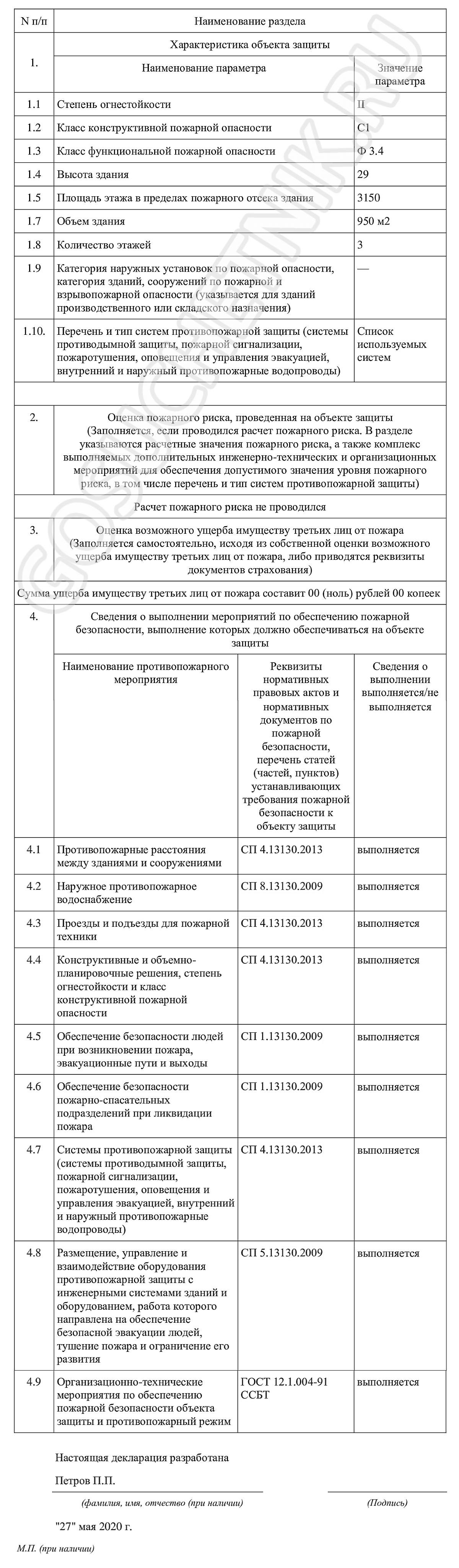 - Примеры заполнения декларации для объектов защиты различного функционального назначения