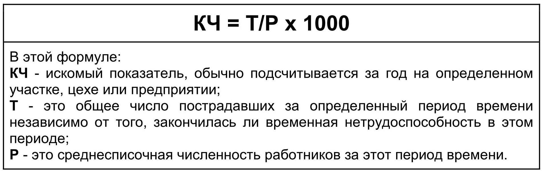 Коэффициент частоты — частное показателя числа несчастных случаев за определенный период, когда количество дней нетрудоспособности превысило три, умноженного на 1000, и показателя среднесписочного числа сотрудников.
