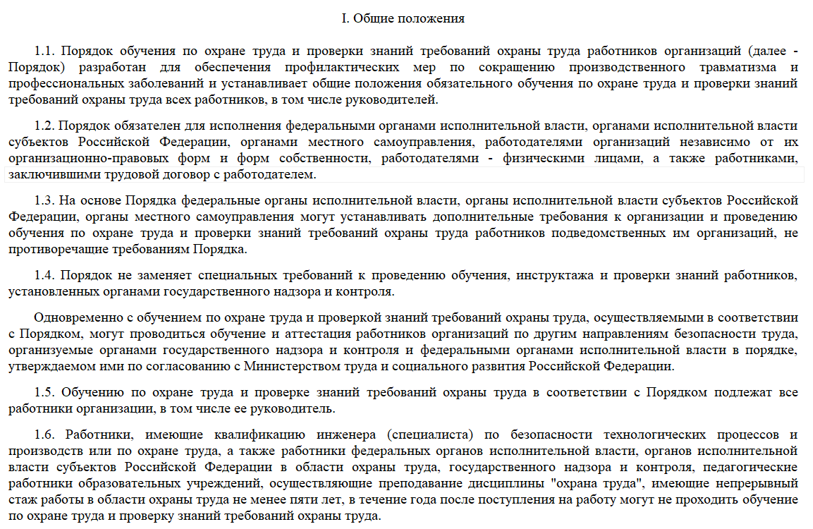 Порядок обучения по охране труда утвержден Постановлением Министерства труда и социального развития и Министерства образования РФ от 13.01.2003 № 1/29, принятым во исполнение норм Трудового кодекса РФ. В ст. 216 ТК РФ указано, что в целях госуправления сферой охраны труда исполнительные органы РФ устанавливают порядок организации и обучения охране труда. Порядок обучения по охране труда обязателен для всех государственных органов (как федеральных, так и региональных) и частных организаций в Российской Федерации и является приложением к Постановлению.